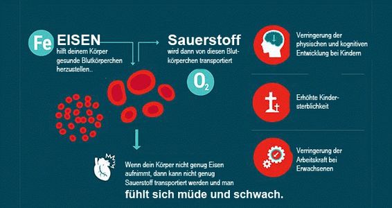 -Ein Mangel an Eisen kann zu Anemia (algemeine Schwaeche und muede) führen.